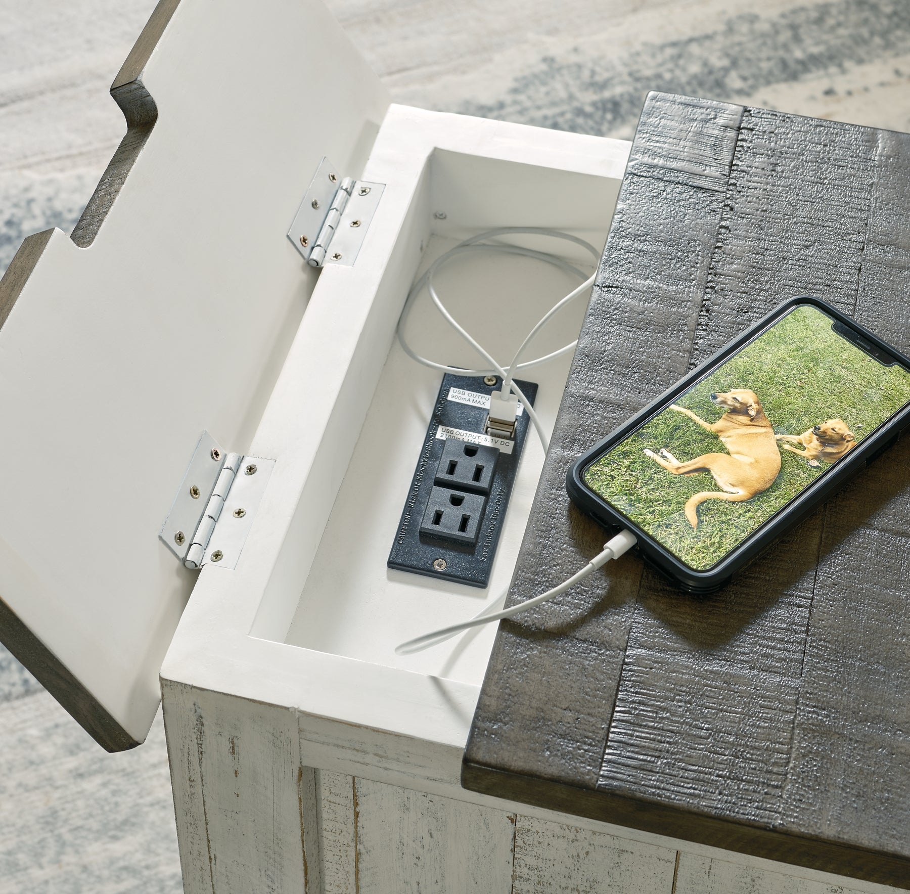What a fresh interpretation of country classic style. Inspired by American farmhouse craftsmanship, but with an elevated sensibility, this chairside end table blends distinctive details such as turned post accents and raised door fronts for a substantial look that feels right at home. Those who appreciate rustic character should take note of the table’s thick crown moulding, beautified with a vintage two-tone finish. A small flip lid located on the top conceals a power outlet and USB ports to keep electronics charged up and close at hand