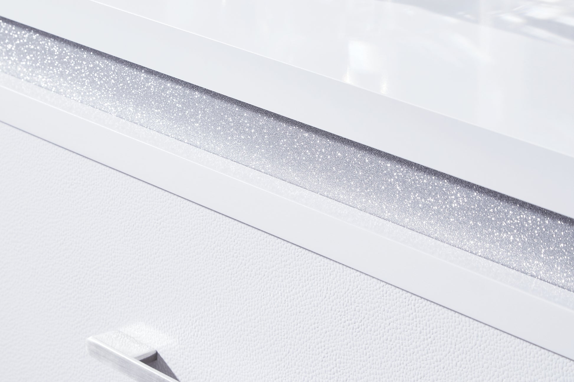 Details Made with hardwood solids and MDF substrates, White paint finish, Inset acrylic glitter accents, Horizontal metal drawer pulls, 2 drawers with fully finished interiors, dovetail construction and heavy-duty ball-bearing side glides, Textured drawer fronts