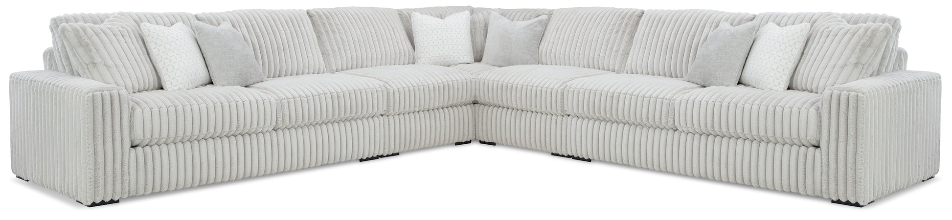 Details Includes 5 pieces: left-arm facing sofa, 2 armless chairs, wedge and right-arm facing sofa, "Left-arm" and "right-arm" describe the position of the arm when you face the piece, Corner-blocked frame, Loose reversible seat and back cushions, High-density foam cushions wrapped in feather-fiber blend jacket, Accent pillows included, Pillows with feather-fiber blend, Polyester upholstery, Exposed feet with faux wood finish, Platform foundation system resists sagging 3x better than spring system after 20,000 testing cycles by providing more even support, Smooth platform foundation maintains tight, wrinkle-free look without dips or sags that can occur over time with sinuous spring foundations